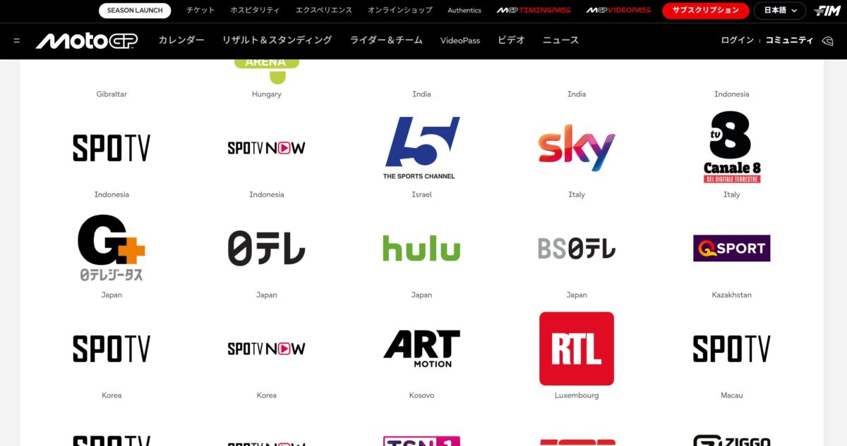 MotoGP公式サイトの、ブロードキャストインフォメーションページに、MotoGP™ Broadcastersとして、日テレやジータスと共にhuluのロゴがあります。